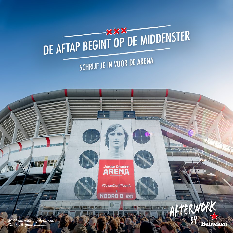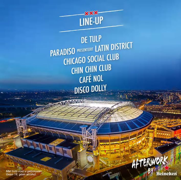 Afterwork by Heineken is dé borrel waar je kunt proosten op het einde van de werkdag en wordt onder andere georganiseerd bij horecapartners van Heineken in Amsterdam, Utrecht, Rotterdam, Den Haag en binnenkort ook in Leiden. De Afterwork by Heineken editie in de Johan Cruijff ArenA is voor zo’n 4000 bezoekers gratis toegankelijk. Dat veel Amsterdammers naar deze editie uitkijken is te zien aan het aantal reacties, inmiddels is de gastenlijst volledig gevuld.