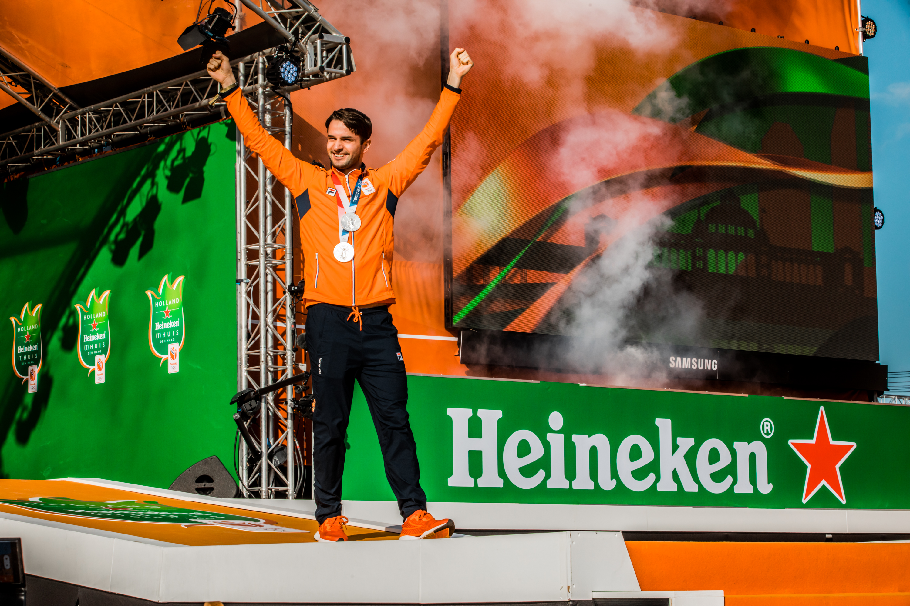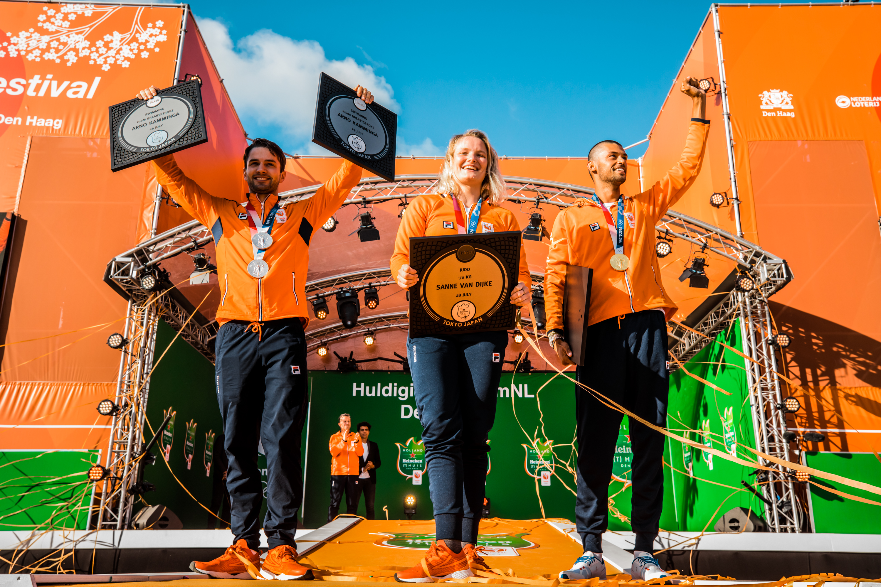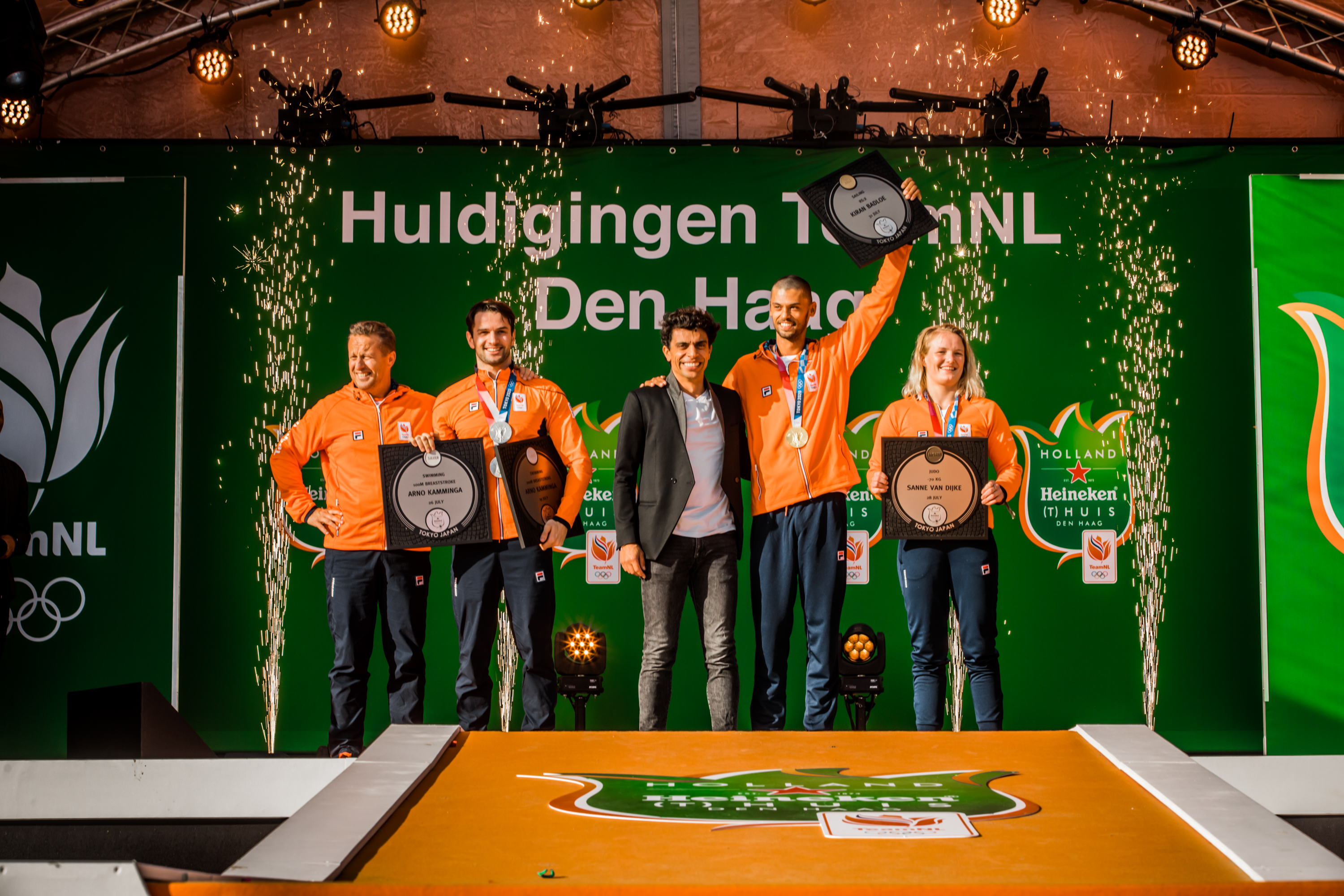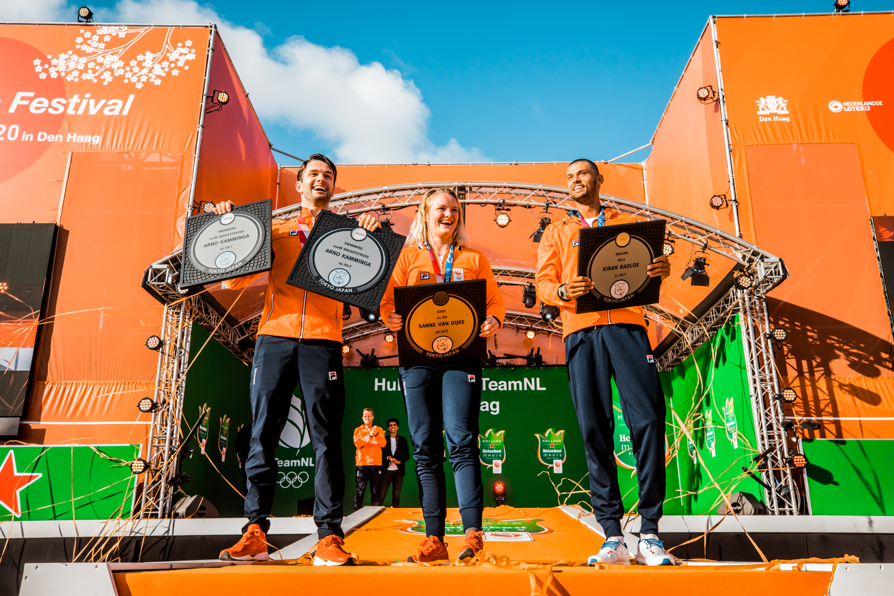 Kiran Badloe, Arno Kamminga en Sanne van Dijke zijn vanavond gehuldigd in Holland Heineken (t)Huis. In het zonnige Scheveningen werden zij door honderden enthousiaste familieleden, vrienden en fans onthaald.