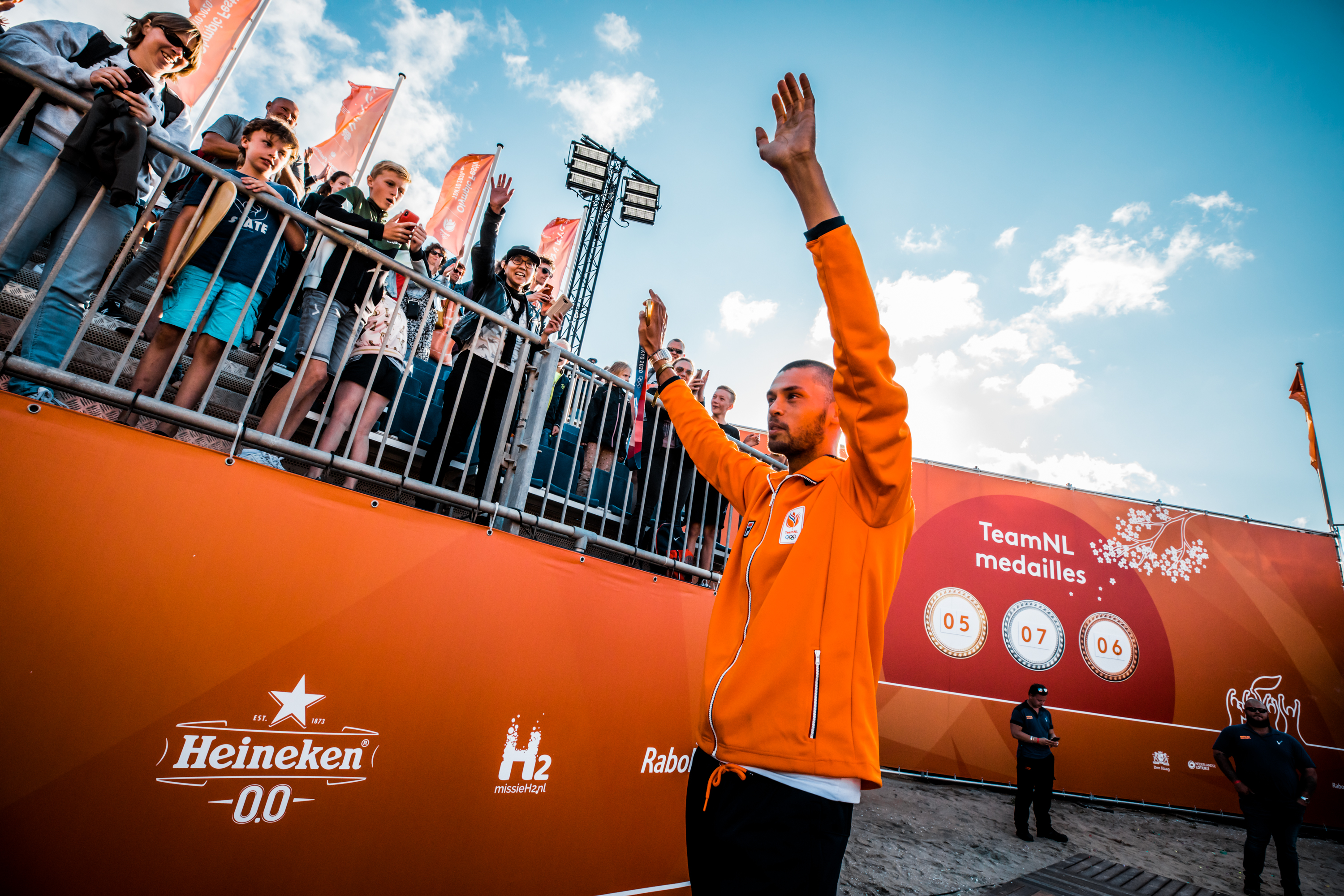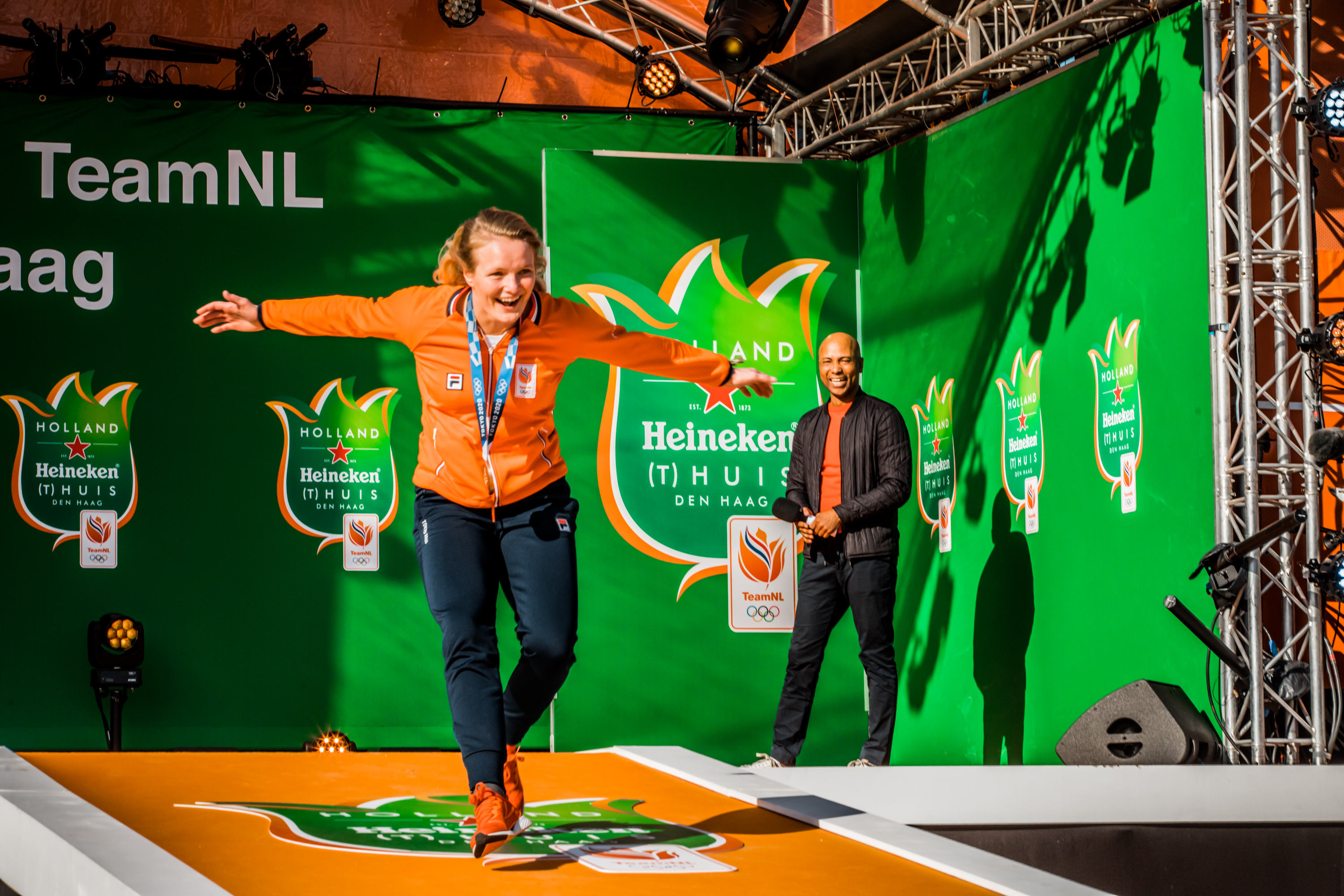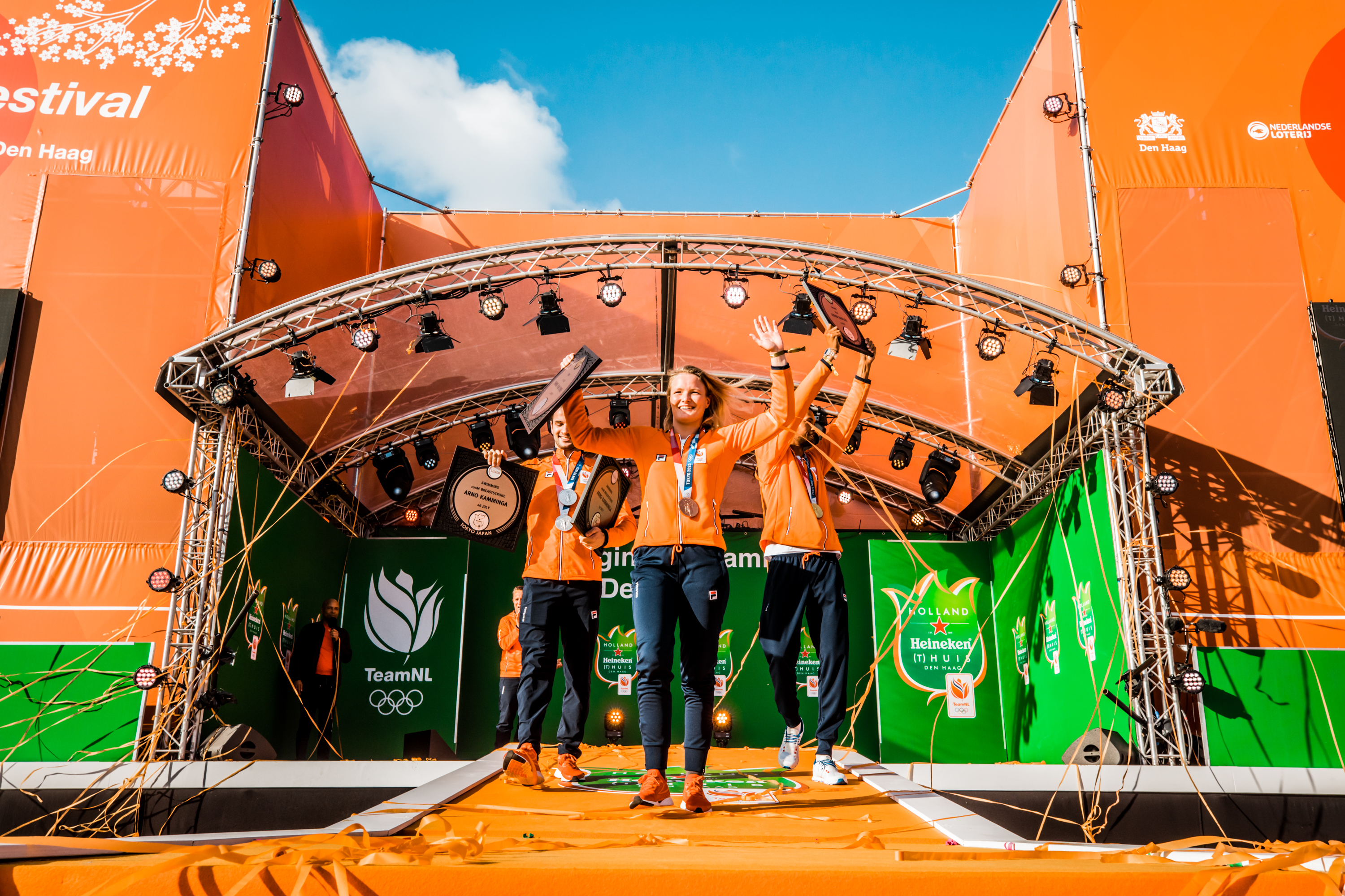 Kiran Badloe, Arno Kamminga en Sanne van Dijke zijn vanavond gehuldigd in Holland Heineken (t)Huis. In het zonnige Scheveningen werden zij door honderden enthousiaste familieleden, vrienden en fans onthaald.