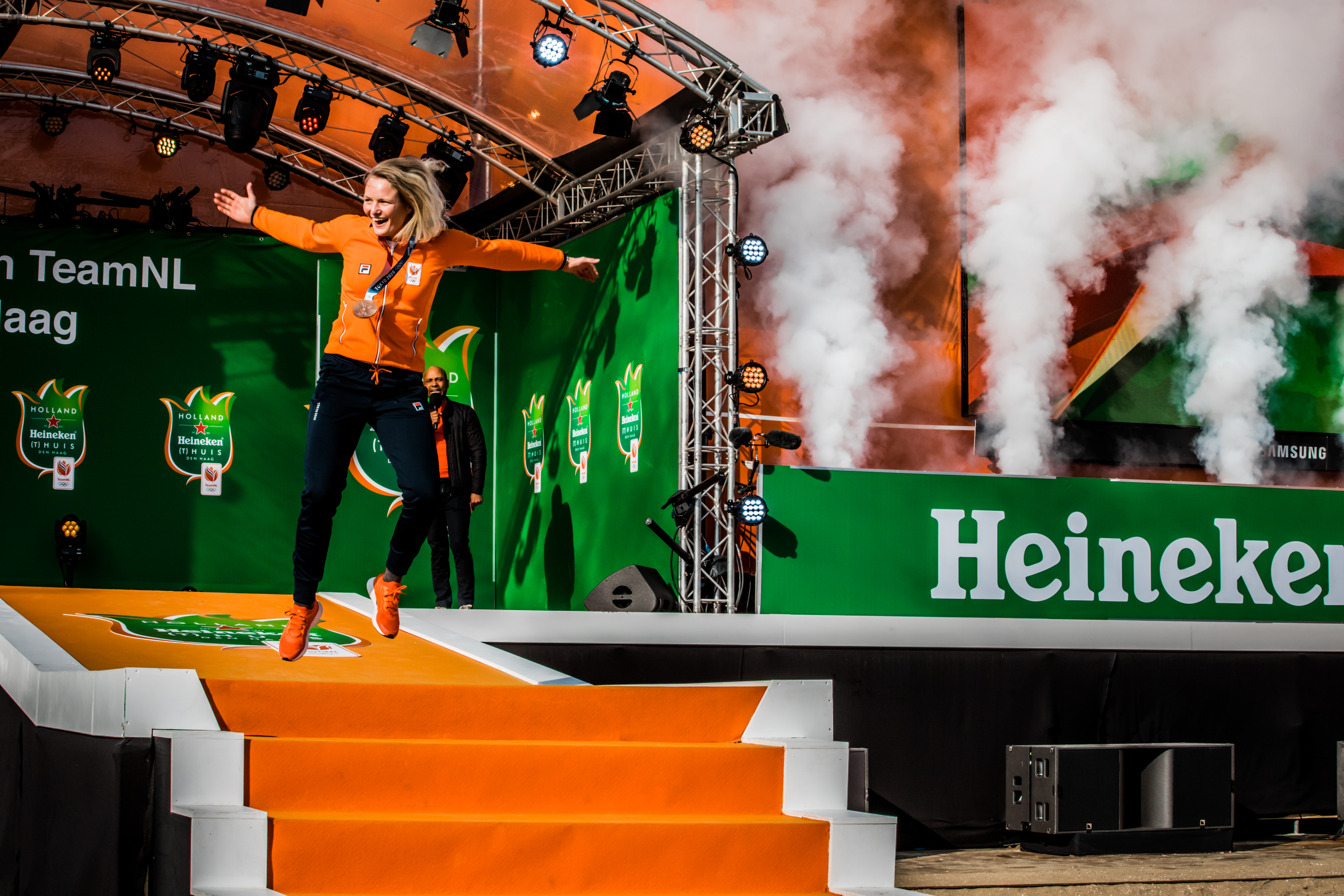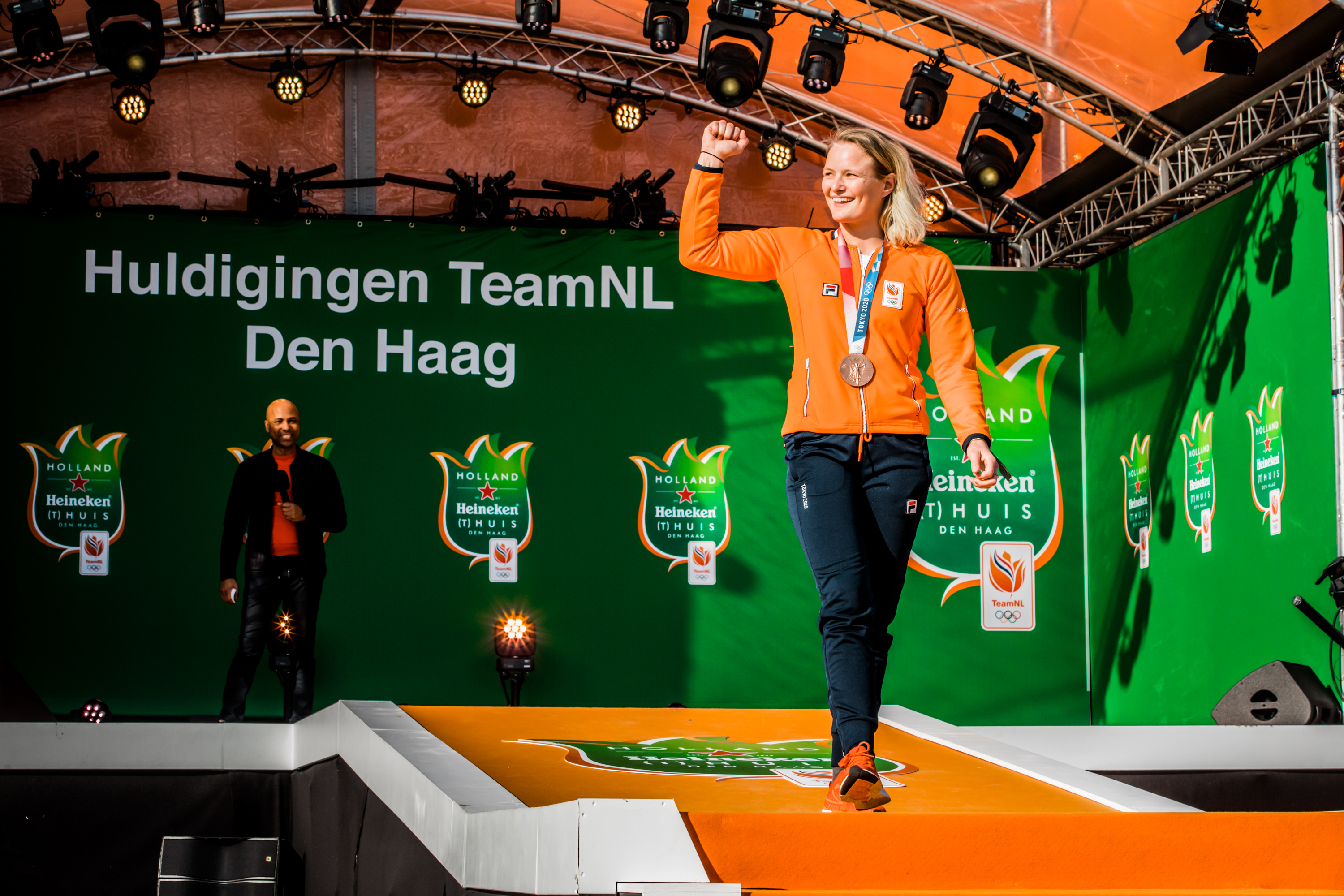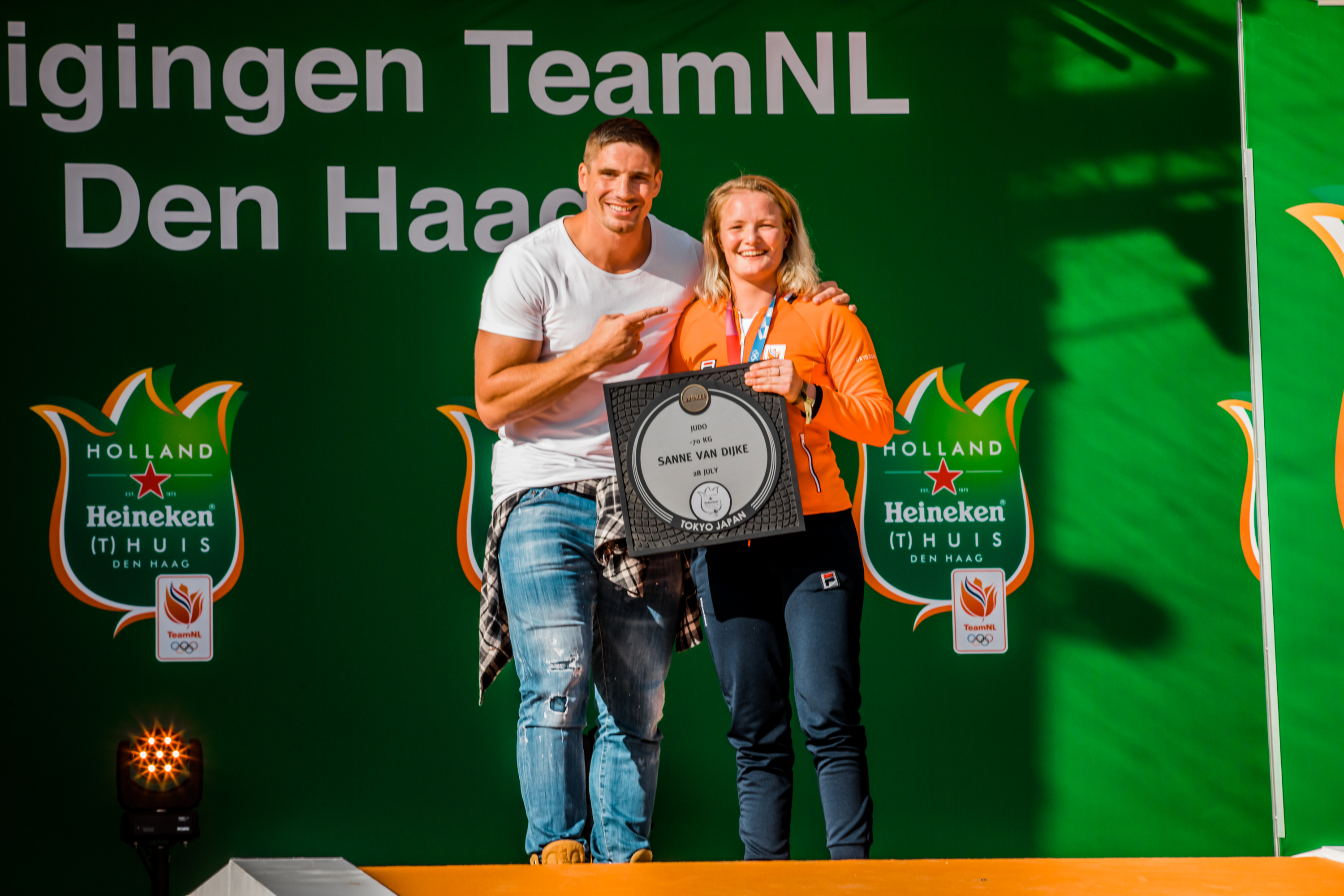 De eerste huldiging was voor de Bronzen Sanne van Dijke. “We hebben het met z’n allen gedaan, mijn gezin, vrienden en coach staan altijd voor mij klaar. Als ik geen energie had, wat zelden voorkomt, dan hielpen zij mij erdoorheen. Daar ben ik heel dankbaar voor.” Sanne ontving de speciale Holland Heineken (T)Huis tegel van Rico Verhoeven. "Wat de mensen zien is wat je gedaan hebt en gepresteerd hebt, wat zij niet zien is de strijd die topsporters leveren buiten het oog van de mensen. Je hebt ook privé veel meegemaakt. Ik hoor van iedereen dat je een mooie en motiverende mindset hebt. Alleen daarom al een inspiratie voor iedereen.”