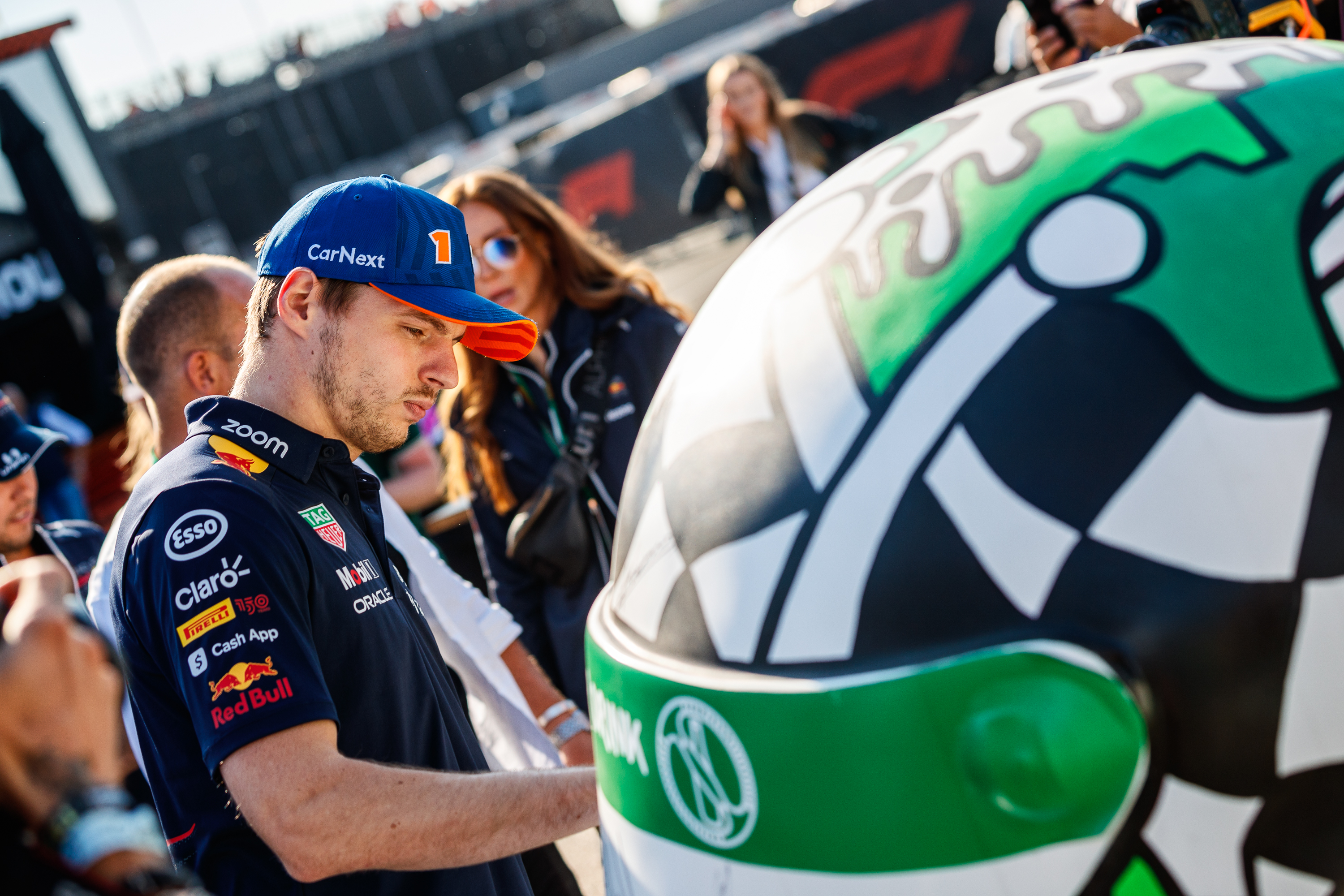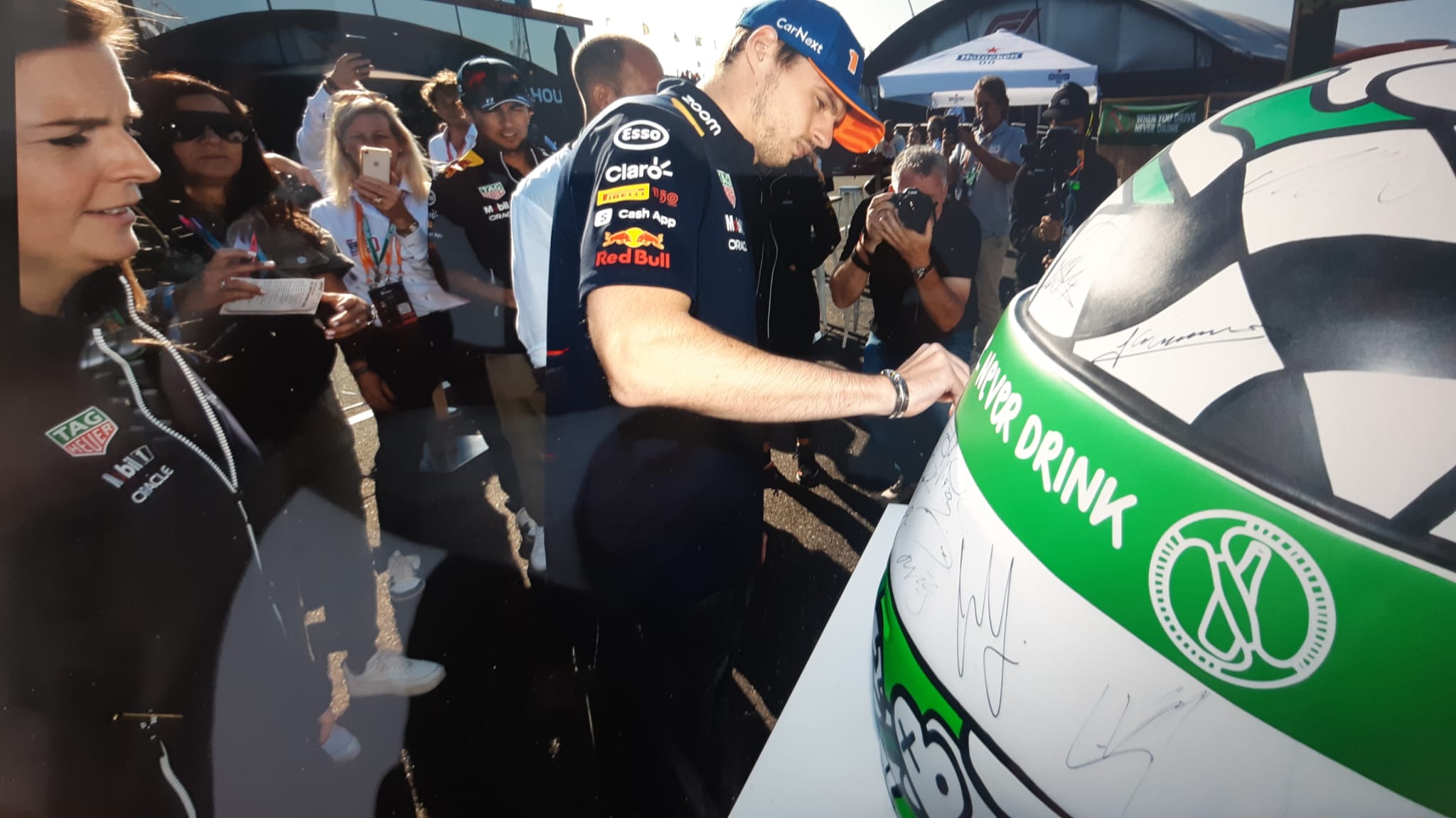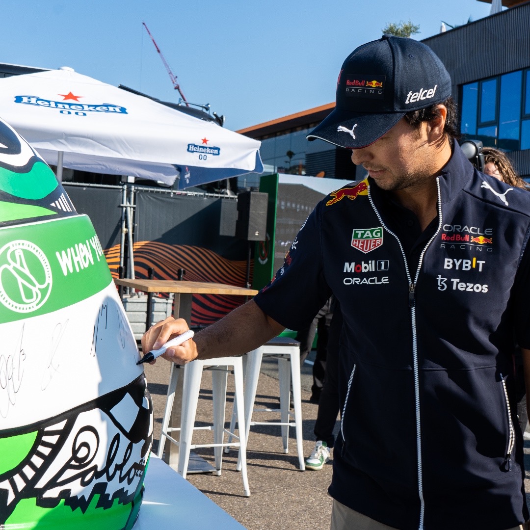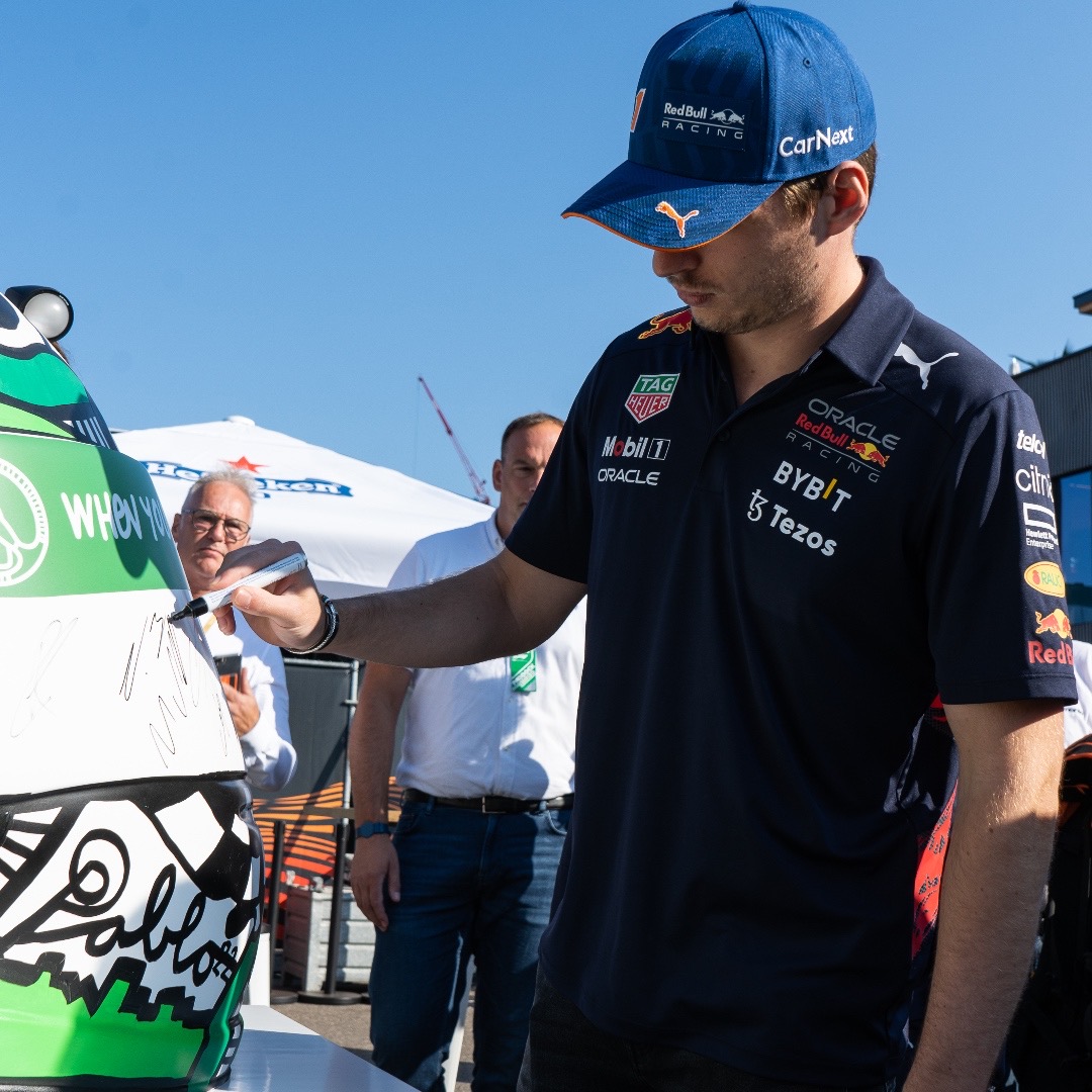 Vandaag hebben Max Verstappen en Sergio Peréz hun handtekening gezet op een door Pablo Lucker ontworpen helm. Pablo is ook de ontwerper van de F1 Heineken Dutch Grand Prix trophy die morgen wordt uitgereikt. De helm met een diameter van één meter is in dezelfde stijl uitgevoerd en voorzien van handtekeningen van F1 coureurs. Het unieke kunstwerk wordt geveild; geïnteresseerden kunnen een bod doen via http://matchwornshirt.com/heineken. De opbrengst van de veiling komt, in het kader van Heineken’s ‘When You Drive Never Drink’ campagne, ten goede aan Veilig Verkeer Nederland.