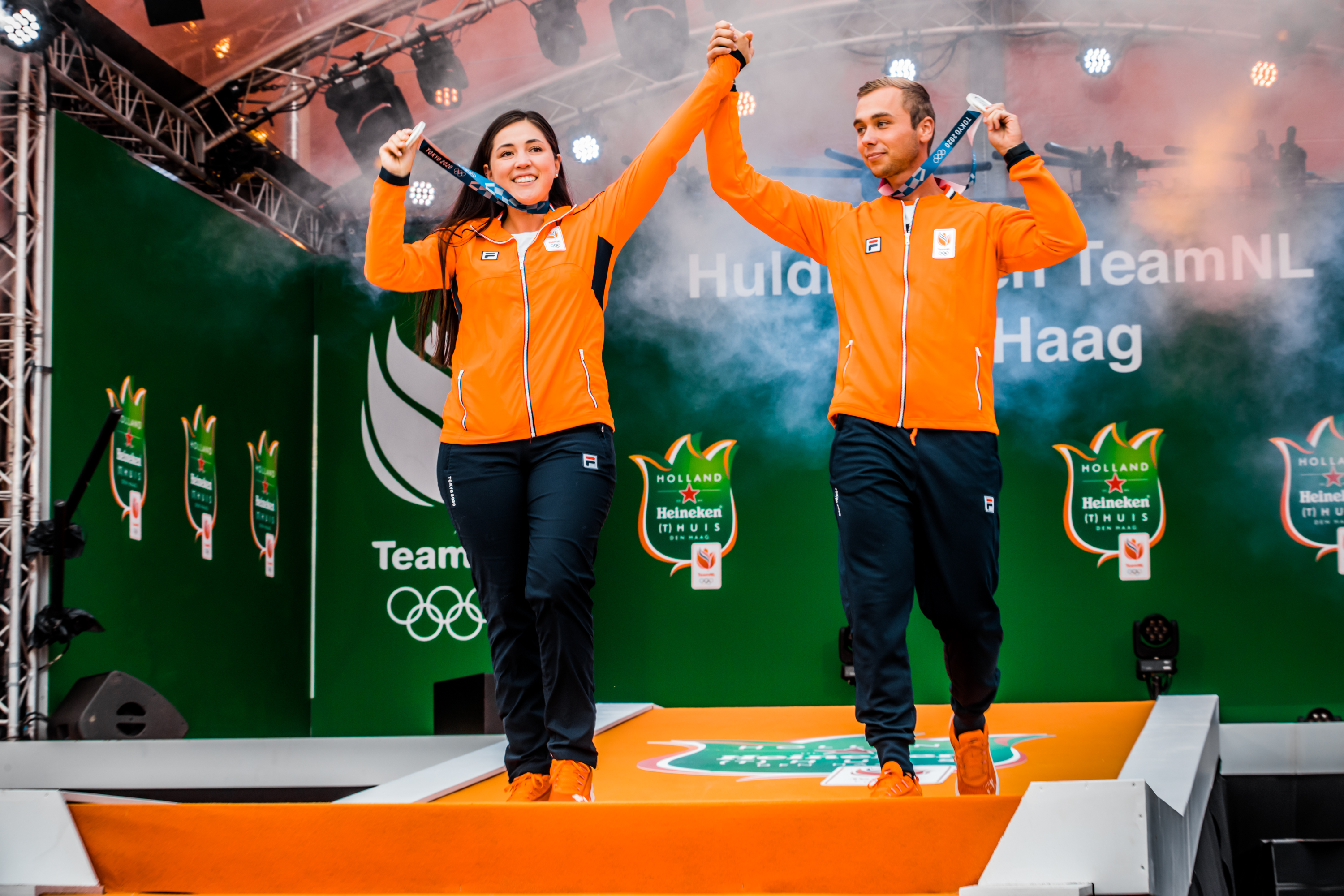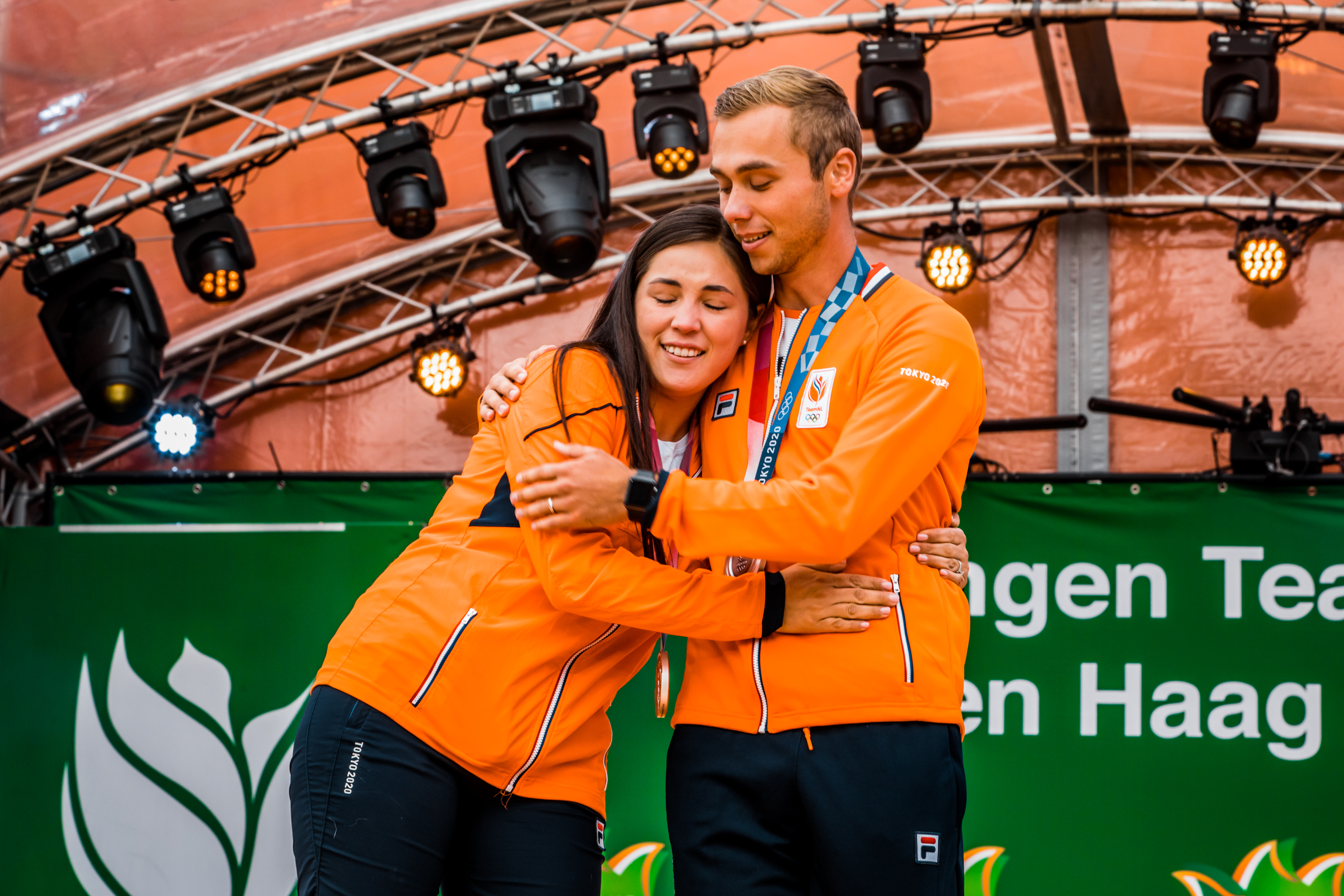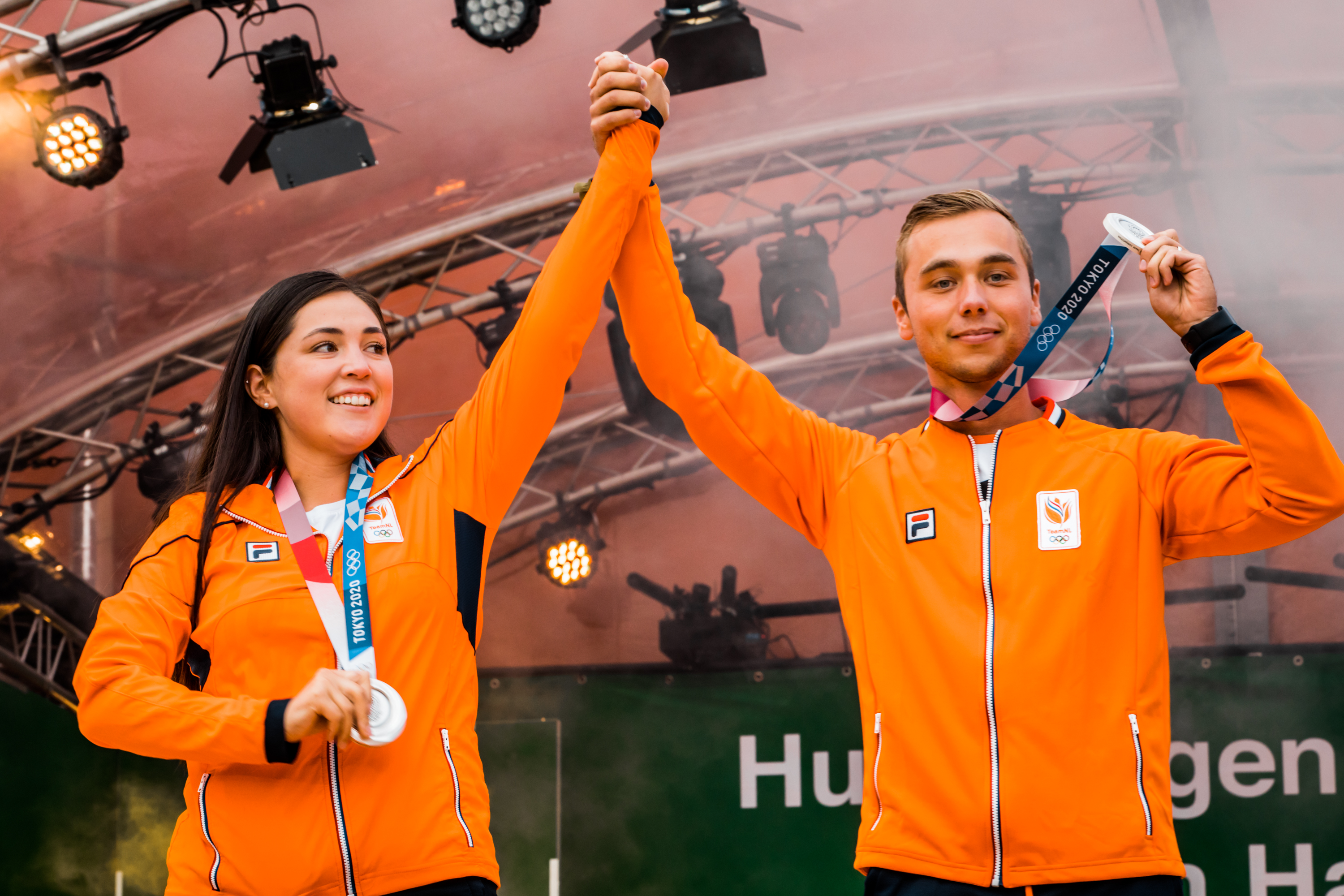 Steve Wijler en Gabriela Schloesser wisten op 24 juli de eerste medaille voor Nederland te pakken in Tokyo. Ze verloren in de finale nipt van Zuid-Korea. Gabriela, van oorsprong Mexicaanse, deed eerder mee aan de Spelen in Rio onder haar meisjesnaam Bayardo. Daarna trouwde ze met handboogschutter Mike Schloesser en sindsdien komt ze uit voor Nederland. Samen met Steve Wijler haalde zij de eerste zilveren plak voor TeamNL. Gabriela was direct in tranen toen zij het podium betrad in Scheveningen. "Ik ben heel emotioneel. Dat er zoveel mensen zijn gekomen, had ik niet verwacht. Het is heel bijzonder." De tegel werd uitgereikt door de man van Gabriela, Mike Schloesser: "Ze trainen er erg hard voor en je ziet de passie voor de sport ook in het schieten. Ik ben super trots op jullie. Deze medaille moest gewoon komen."
