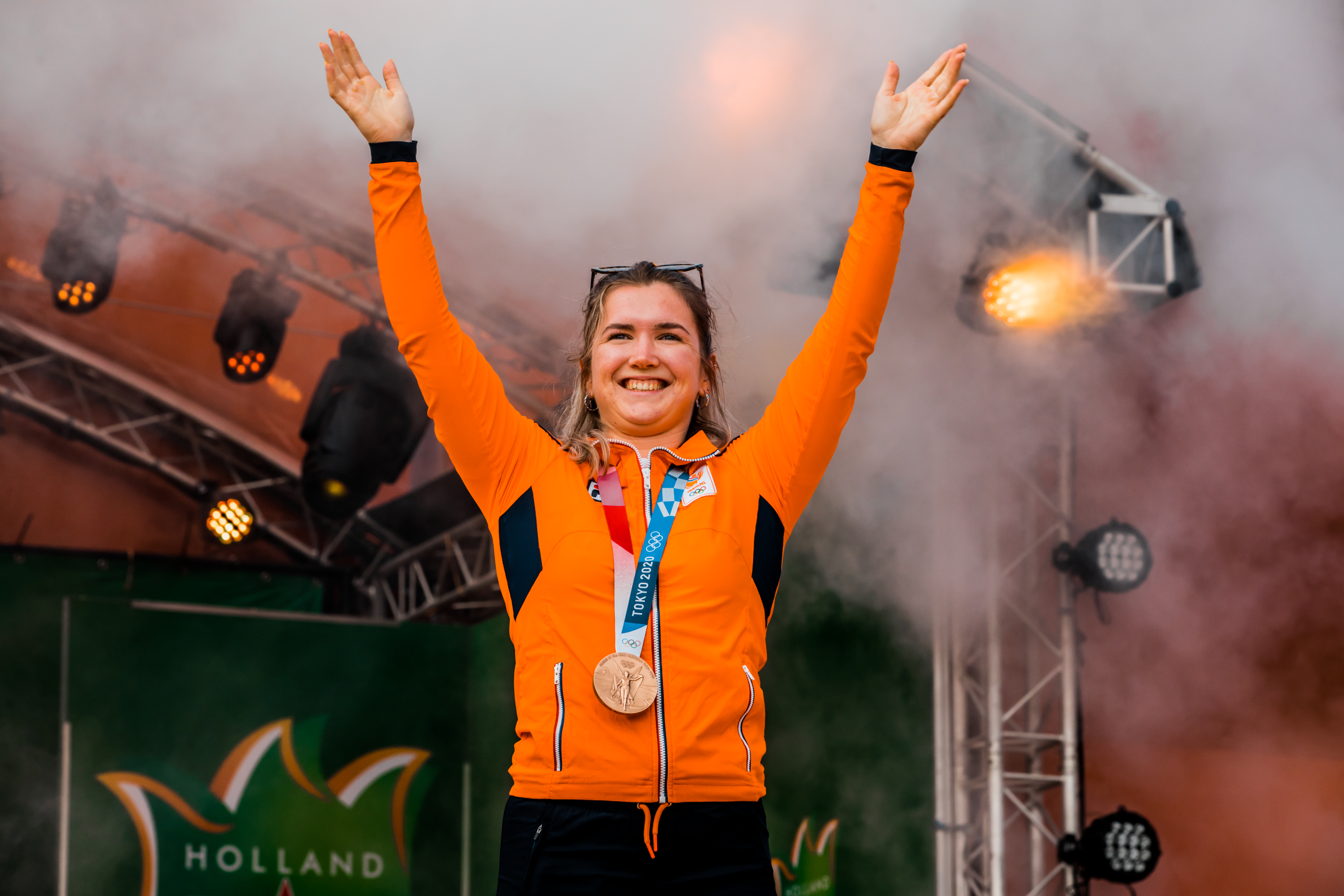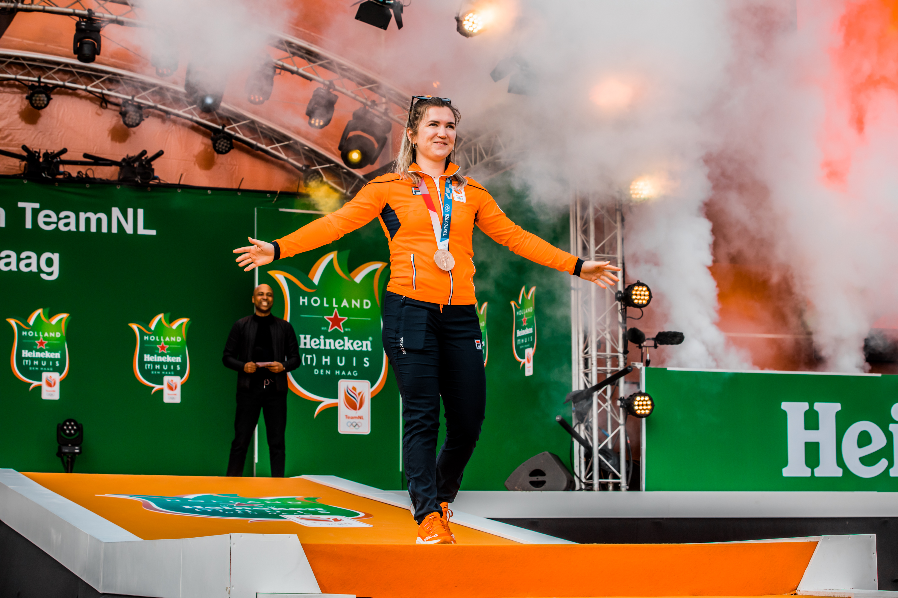 Opnieuw werden vanavond drie Olympische medaille winnaars gehuldigd in het Holland Heineken (t)Huis op het TeamNL Olympic Festival in Den Haag. Merel Smulders kreeg de tegel uitgereikt van haar zus Laura, die eerder al een bronzen medaille veroverde in Londen. Zelf viel topfavoriet Laura in de eerste run van de halve finale. Ze was tot tranen geroerd toen haar zus Merel in haar voetsporen trad door als derde over de finish te komen in de finale in Tokyo. In het Holland Heineken (t)Huis sprak ze haar zus lovend toe: "Ik wilde heel graag samen de finale fietsen. Ik ben gigantisch trots op je. We zijn niet alleen de Smulders sisters maar ook de bronzen sisters. Je moet super trots zijn op jezelf. Je verdient deze medaille echt."